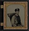 A. J. Blue, cavalry soldier in Union shell jacket and bummer cap with three Remington revolvers in his belt, holding a sword