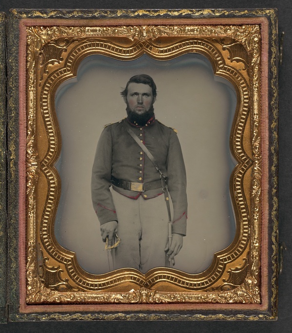 Unidentified soldier in Union artillery uniform with red piping holding sword