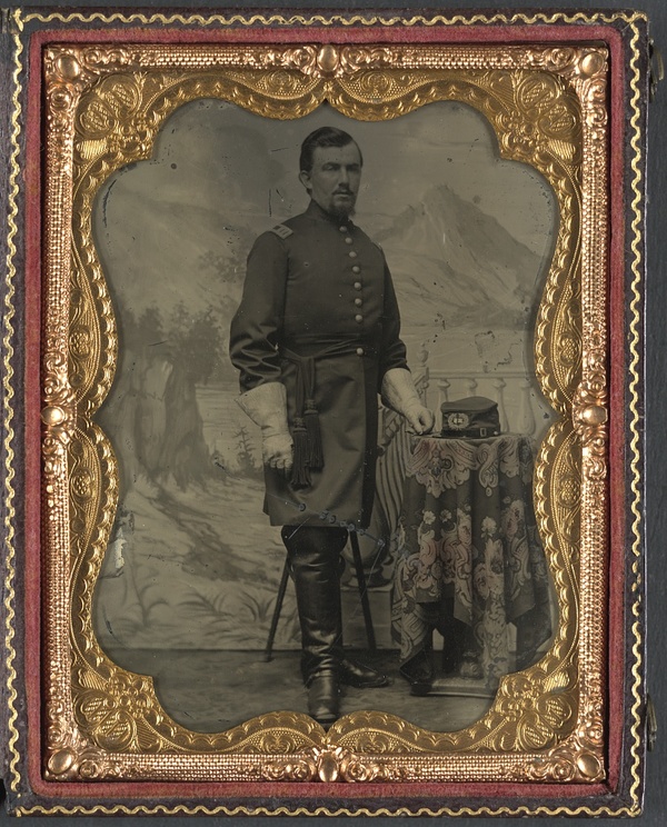 Unidentified soldier in Union captain's uniform with U.S. Medical Service hat in front of painted backdrop showing landscape