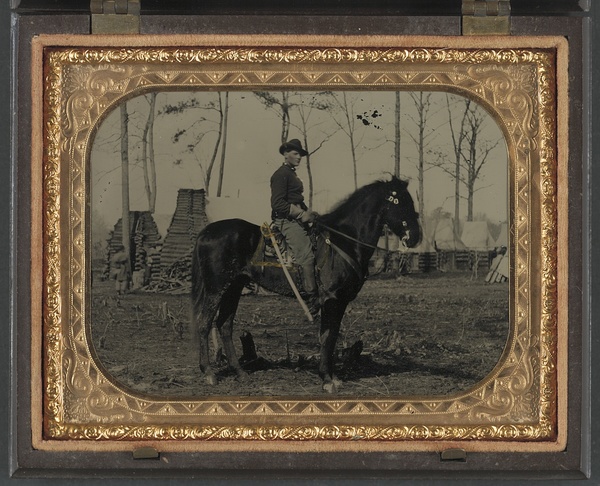 Unidentified soldier in Union cavalry uniform, on horse, with cavalry saber, in front of encampment with winter chimneys