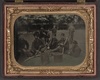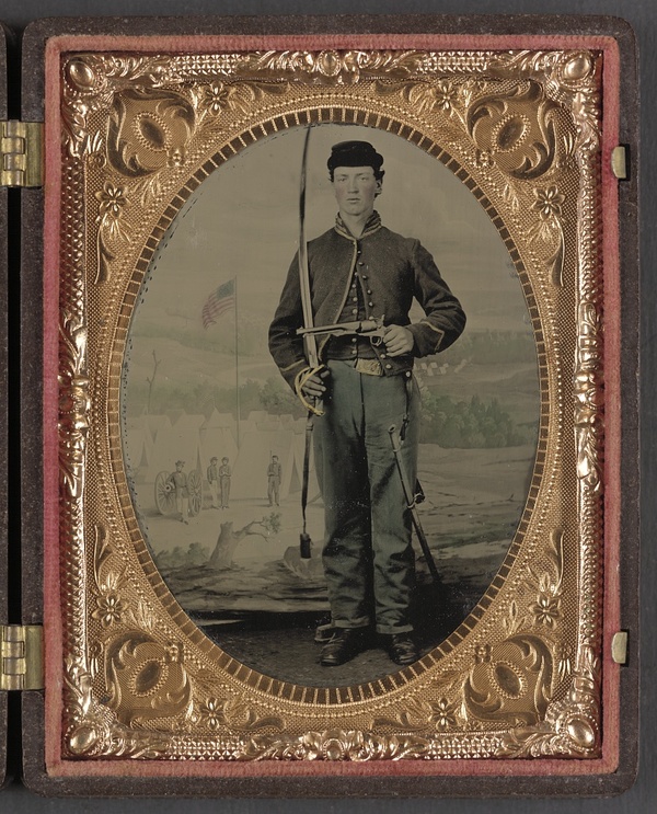 Unidentified soldier in Union cavalry uniform with sword and pistol in front of painted backdrop tree stump and military camp