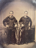 Unidentified sailors in Union uniforms with American flag in front of painted backdrop showing ship deck with Monitor class ship in the distance