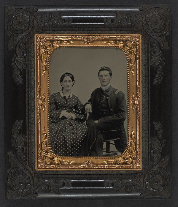 Unidentified soldier in Union first lieutenant's uniform next to unidentified woman in dress