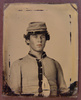 Unidentified soldier in Union greatcoat holding kepi with Infantry Company A insignia