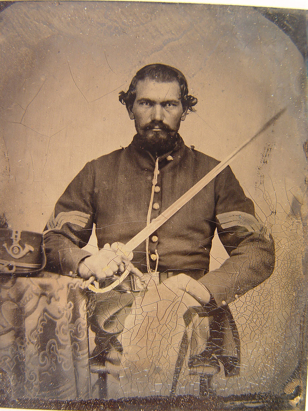 Unidentified soldier in Union infantry sergeant's uniform holding a model 1840 non-comissioned officer's sword next to table with Company H, 6th Regiment Hardee hat on top