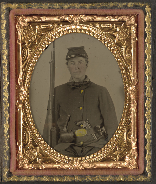 Unidentified soldier in Union infantry uniform with rifle and 3rd Model Beals' revolver
