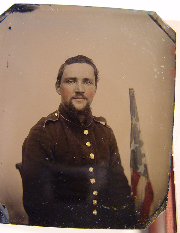 Unidentified soldier in Union corporal's uniform holding Company B, 15th New Hampshire Volunteers kepi