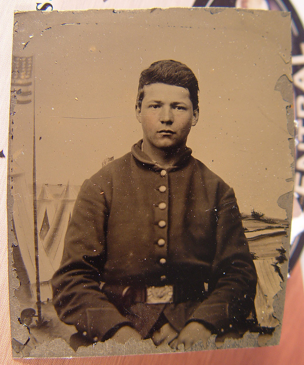 Unidentified young soldier in Union sack coat, forage cap, and white gaiters with sword