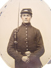 Five soldiers, four unidentified, in Union uniforms of the 6th Regiment Massachusetts Volunteer Militia outfitted with Enfield muskets in front of encampment