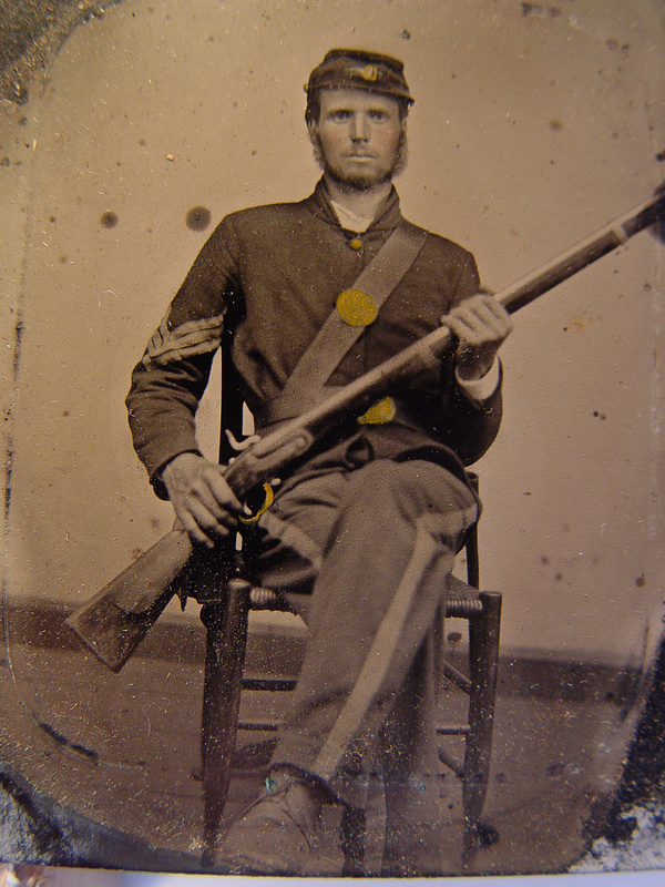 Unidentified soldier in Union sergeant's uniform sitting on a chair and holding a musket