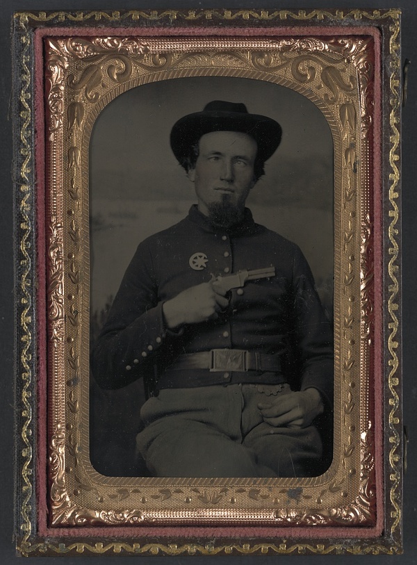 Unidentified soldier in Union shell jacket with 7th Corps Dept. of Arkansas insignia and 1851 rectangular eagle belt plate holding volcanic pistol to his chest