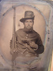 Unidentified soldier in Union shell jacket and infantry Hardee hat with sheathed Bowie knife, bayoneted musket, and 1849 Colt pocket revolver
