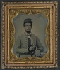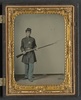 Unidentified soldier in Union uniform and Company B hat, with Hall breech loading carbine rifle, Colt revolver, and cavalry sword