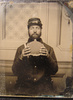 Unidentified soldier in Union greatcoat and Company C forage cap with musket