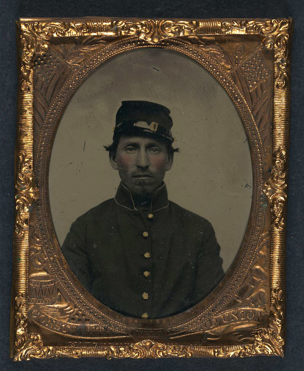 Unidentified young soldier in Union sack coat, forage cap, and white gaiters with sword