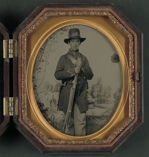Unidentified soldier in Union uniform and Hardee hat with rifle in front of painted backdrop showing military camp