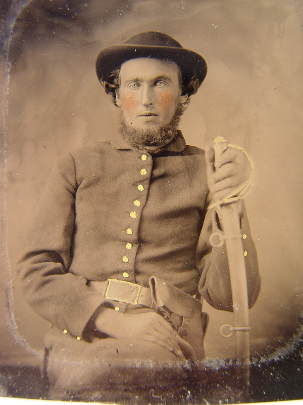 Unidentified soldier in Union uniform and slouch cap sitting with holstered revolver and cavalry saber