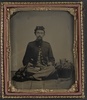 Unidentified soldier in Union uniform with fork, knife, plate, and cup sitting on the floor and preparing to eat a slice of the apple on his lap