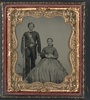 Unidentified man, woman, and child and unidentified soldier with musket and woman