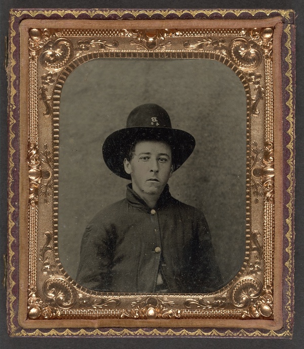 Unidentified girl in mourning dress holding framed photograph of her father as a cavalryman with sword and Hardee hat