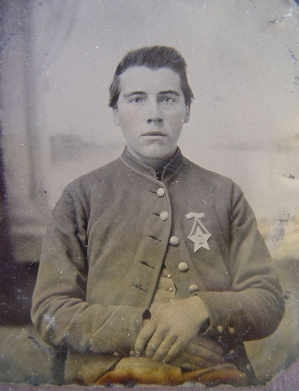 Unidentified soldier in Union uniform with 28th Pennsylvania badge in front of painted backdrop showing window