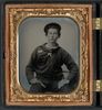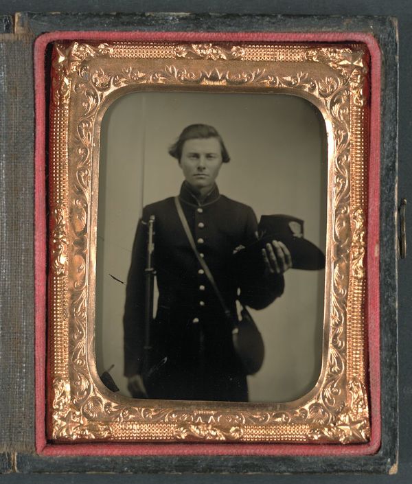 Unidentified soldier in Union uniform with bayoneted musket, canteen, and Hardee hat