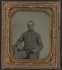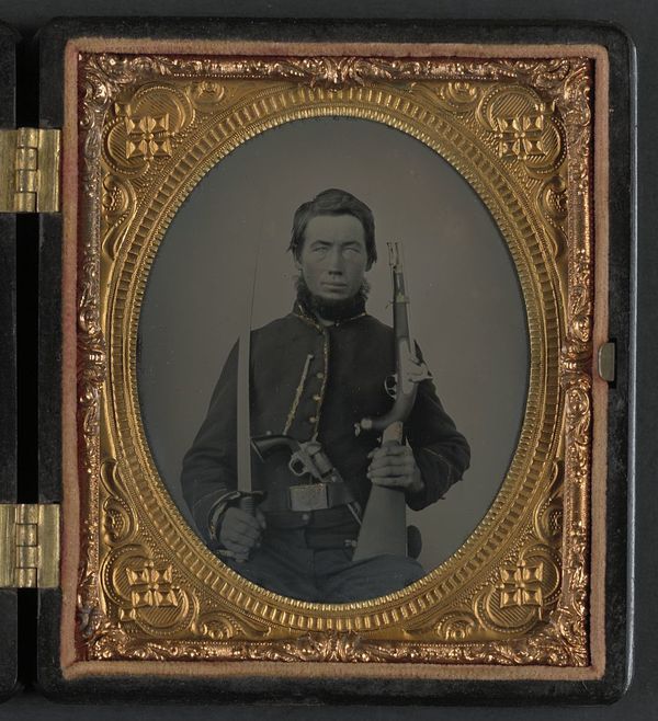 Unidentified soldier in Union uniform with cavalry saber, single shot pistol carbine, and Colt Navy revolver