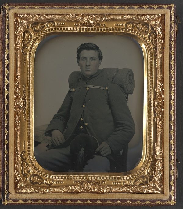 Unidentified soldier in Union uniform with fez, backpack, and bedroll