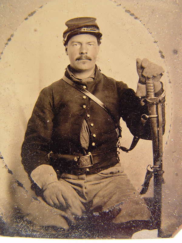 Unidentified soldier in Union uniform with gauntlets, holstered revolver, and U.S. Model 1860 Light Cavalry saber