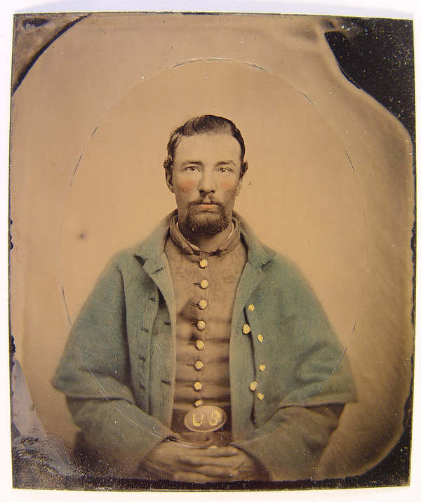 Unidentified young soldier in Union uniform with shoulder scales and forage cap with Company I insignia holding revolver and bayoneted musket