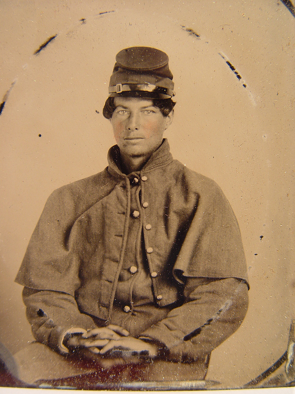 Unidentified soldier in Union uniform with greatcoat and forage cap