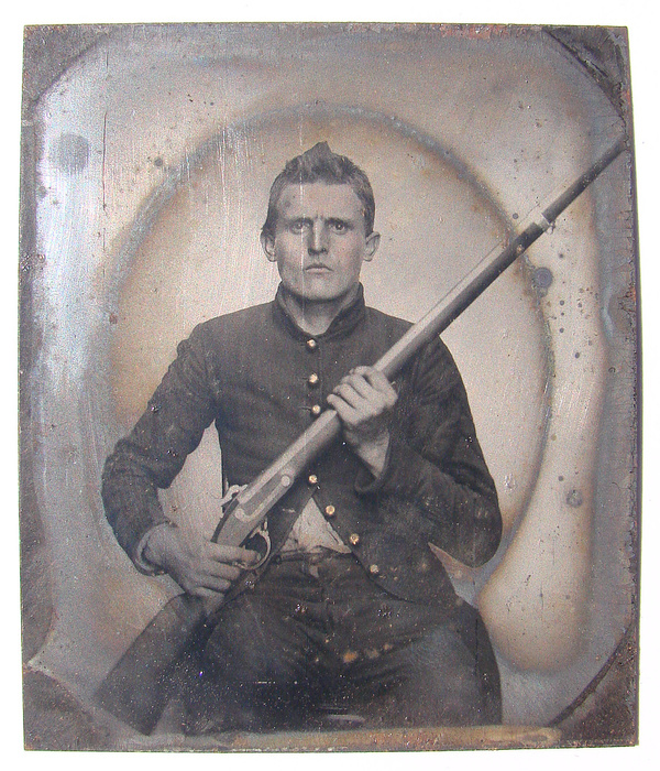 Unidentified soldier in Union uniform with U.S. breast plate with revolver and bayonet in scabbard