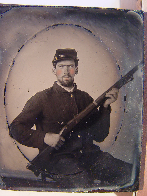 Unidentified young soldier in Union rifleman's uniform and shoulder scales with musket and attached U.S. Model 1862 sword bayonet