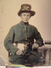 Unidentified young soldier in Union uniform and plumed Hardee hat with plain gauntlets and revolver sitting next to table with books