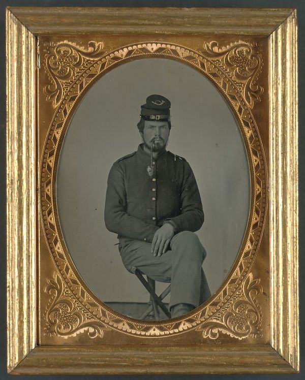 Unidentified soldier in infantry uniform sitting between two women, probably relatives