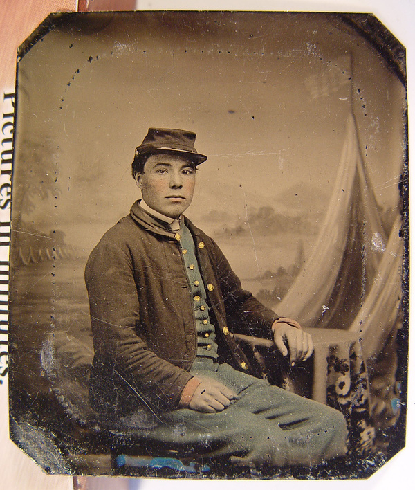 Unidentified soldier in Union uniform with sack coat in front of painted backdrop showing drape and landscape