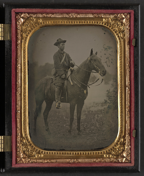 Unidentified soldier in Union uniform with saddle pistols and canteen on horseback