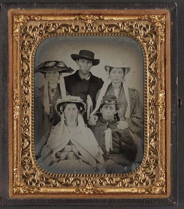 Unidentified soldier in Union uniform with three unidentified women in bonnets and one unidentified man