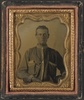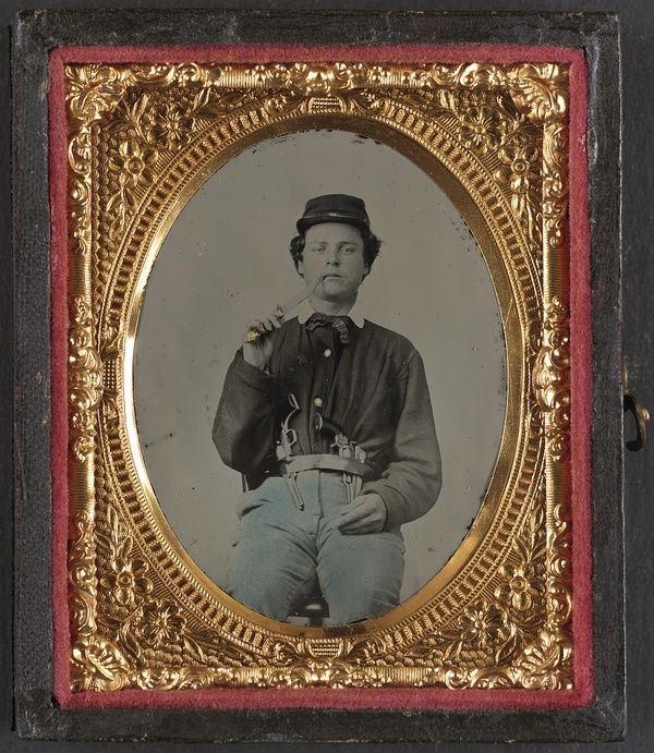 Unidentified soldier in Union uniform with two revolvers and picking his teeth with a Bowie knife