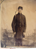 Unidentified soldier in Union frock coat and forage cap with bayoneted musket and cap box in front of painted backdrop showing curtain