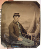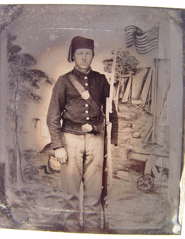 Unidentified soldier in Union uniform, Zouave fez, and New York buckle with cap box, musket, and U.S. Model 1862 "Zouave" sword bayonet in front of painted backdrop showing military camp