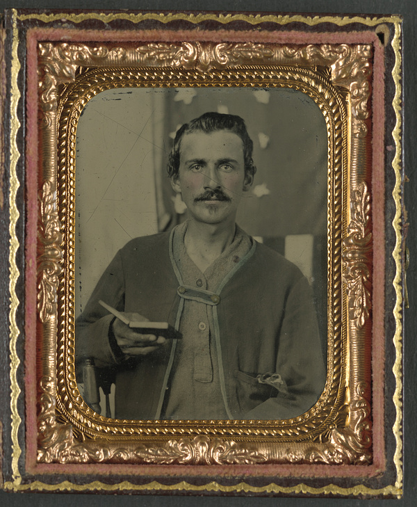 Unidentified soldier in Union Zouave uniform with cased photograph in front of American flag backdrop