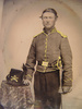 Unidentified soldier in Union cavalry uniform with cavalry saber next to table with Cavalry Company D Hardee hat