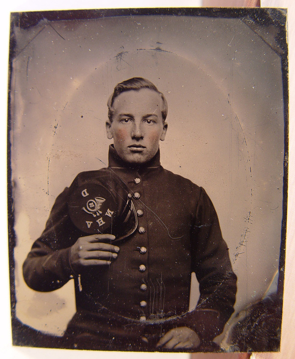 Unidentified Union private holding Company D, 15th New Hampshire Volunteers forage cap over heart
