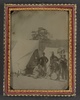 Seven unidentified soldiers in Union uniforms with drum and stacked rifles in front of tent