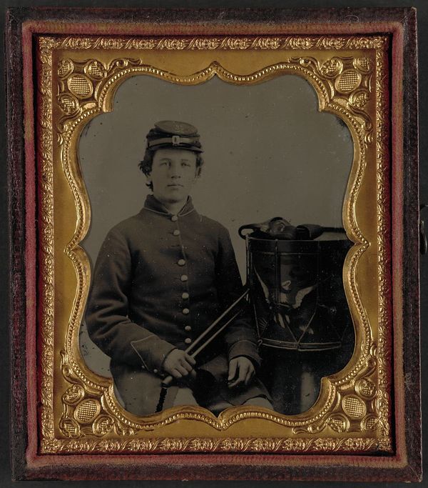 Unidentified soldier in Union uniform and Hardee hat with rifle in front of painted backdrop showing military camp