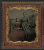 Two unidentified young women wearing printed dresses and necklaces in front of painted backdrop showing plantation