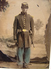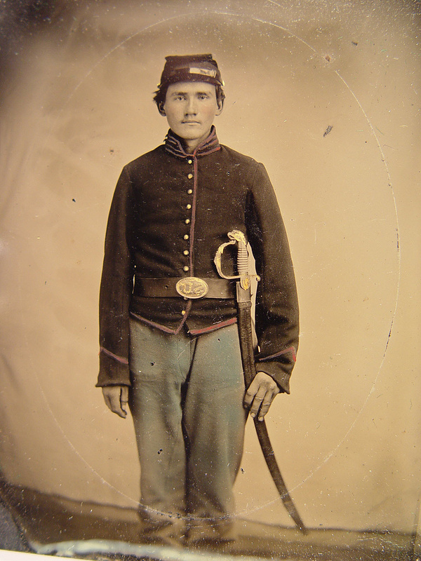 Unidentified young soldier in Union artilleryman's uniform standing with Eaglehead sword