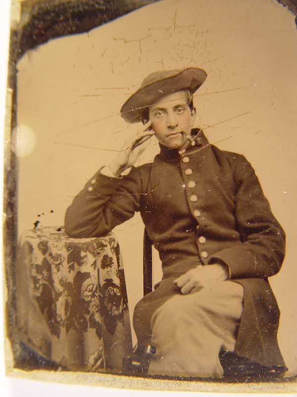 Unidentified young soldier in Union frock coat and slouch hat smoking pipe