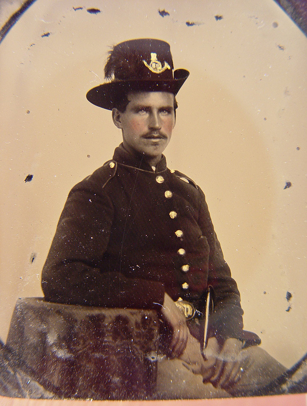 Two unidentified soldiers in Union uniforms holding cigars in each others' mouths